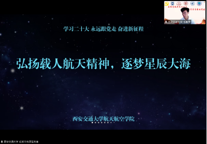 毛新宇同志以“弘扬载人航天精神,逐梦星辰大海”为主题,从载人航天工程发展史、什么是载人航天工程以及为什么要发展载人航天等方面进行分享,号召青年学子传承并弘扬特别能吃苦、特别能战斗、特别能攻关、特别能奉献的载人航天精神。