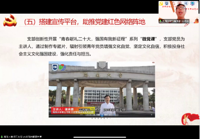 华东政法大学政府管理学院第二学生党支部苏恒甫同志以“涵养政治志气,夯实担当底气,激扬蓬勃朝气”为主题,具体从“抓联系,党领团建培养血液”“抓建设,夯实各项制度规则” “抓示范,践行宗旨服务他人”“抓宣传,当好校园宣传媒介”“抓学习,提高学生党性修养”“抓活动,特色活动凝结聚力”六个方面分享了支部建设的宝贵经验。