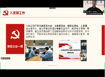 西安交通大学航天学院21级硕士第四党支部组织委员张尔琦同志从党支部组织机构、支部工作、未来展望三个方面对支部建设进行分享交流,通过对支部现有问题进行分析,提出创新党建形式、开展多样化交流等改进措施,进一步明确了支部未来的发展方向。