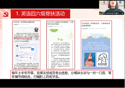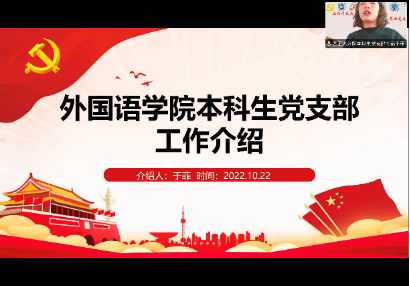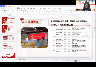 西北工业大学外国语学院本科生党支部书记于菲同志介绍了支部整体情况、“三会一课”开展情况、支部特色活动等内容,着重分享支部结合专业特色帮扶英语学习的活动形式,强调要进一步提升党支部组织力,强化党支部政治功能,充分发挥党支部战斗堡垒作用。