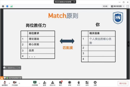 此次讲座围绕简历制作理念、简历结构以及内容撰写三部分展开。武丹导师通过“如何提高简历命中率”等一系列问题和同学们互动,就用人需求、核心竞争力及自我定位三部分向同学传授自我营销技巧,并指出在制作简历时应遵循匹配原则,通过匹配岗位的核心优势建立简历逻辑。另外导师建议同学们制作简历时应注意版面布局,保持排版简洁清晰,利用实线条引导阅读视线。