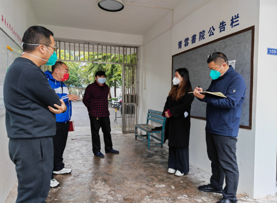 2023年1月9日下午,青云书院全体辅导员、楼管在书院党委副书记(主持党委工作)罗国忠的带领下,一一走访了7栋、8栋、30栋、31栋、32栋学生楼栋,检查楼栋存在的安全隐患,核查留校学生信息,走访留校学生宿舍。