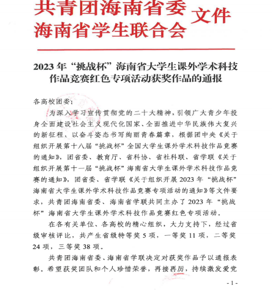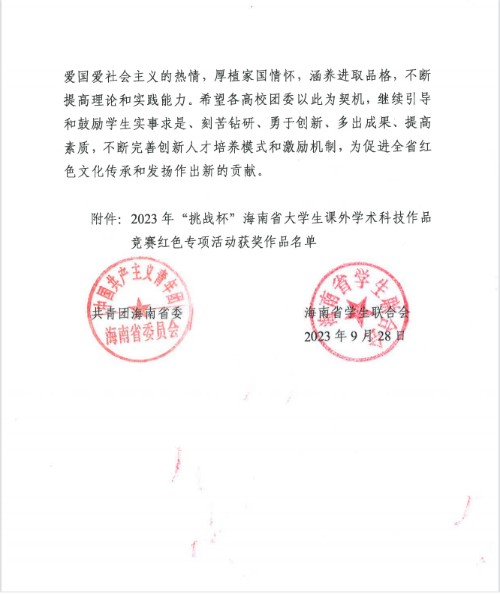 为引领广大青少年投身全面建设社会主义现代化国家、全面推进中华民族伟大复兴的新征程,以奋斗姿态书写绚丽青春篇章。根据“挑战杯”相关文件要求,共青团海南省委、海南省学联共同主办了2023年“挑战杯”海南省大学生课外学术科技作品竞赛红色专项活动。