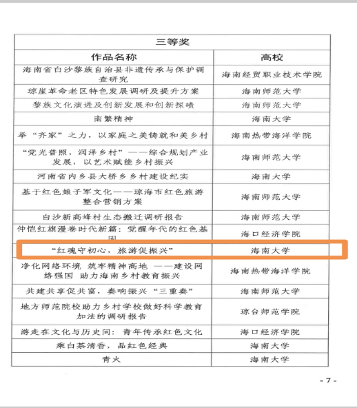 根据省级评比结果,共青团海南省委、海南省学联决定对获奖作品进行通报表彰。在此次评比中,我院学生作品“红魂守初心,旅游促振兴”荣获了三等奖。