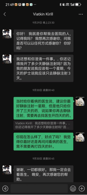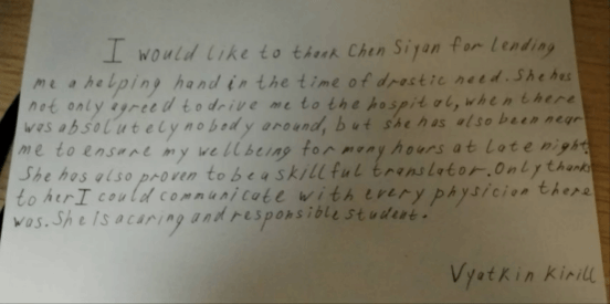 陈思言同学考虑到学校里打不了车,便赶紧上楼取了电动车钥匙,用电动车送Viatkin Kirill到了海口市人民医院急诊科,结果确诊为急性疾病发作,需要紧急救治。由于Viatkin Kirill当时痛苦的说不了话,陈思言同学便帮他挂号、拿药、取化验单、当翻译……一直忙到Viatkin Kirill挂上了吊瓶,脱离了危险才回到学校,此时已是凌晨四点钟。