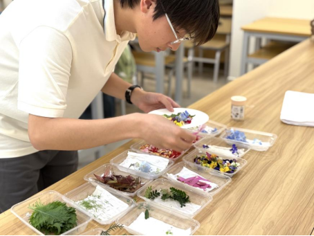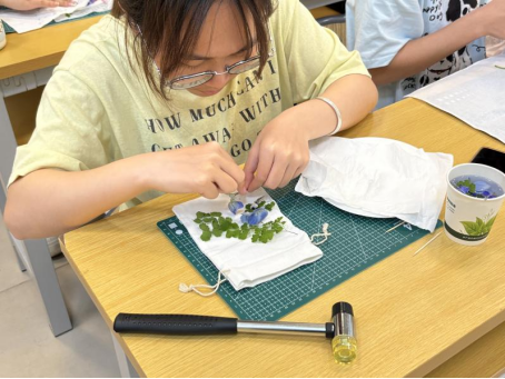 同学们精心挑选形态完整、色泽鲜艳的叶片与花瓣,用明矾水对它们进行固色处理,再将其艺术化地排列在帆布包上。伴随着叮咚作响的敲打声,植物汁液缓缓渗透进织物,最终,每件作品都化作了独一无二的“自然指纹”。课堂上弥漫着草木清香,同学们互相展示着创意成果。