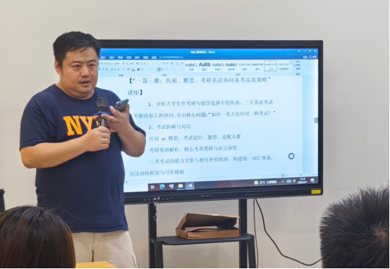 讲座特邀拥有15年国际考试教学与管理经验的资深英语教育专家韦睿担任主讲。韦睿老师开篇直击要害,精准剖析了当代大学生在考研与留学抉择中的困惑与焦虑。通过系统对比托福、雅思、考研英语三大考试的异同点,他创新性地提出"一套方法应对三种考试"的核心备考理念,这一独到见解立即引发了在场学子的强烈共鸣,现场求知氛围瞬间升温。