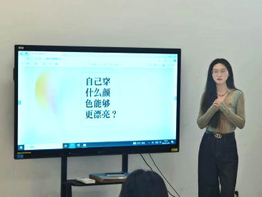 在理论知识学习环节,余老师为大家详细讲解了色彩纯度理论概念,以及如何通过色调图来理解和运用色彩。掌握这些理论知识,有助于大家更好地把握色彩之间的关系,为穿搭配色打下坚实基础。余老师还从肤色、瞳孔、嘴唇、掌心及头发等五个部位,教同学们如何定位自身肤色,并匹配适合自身肤色的衣着色彩群。