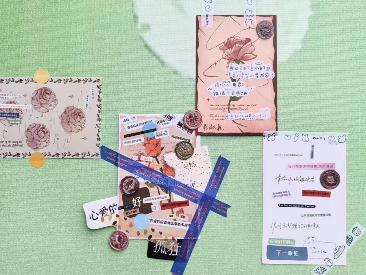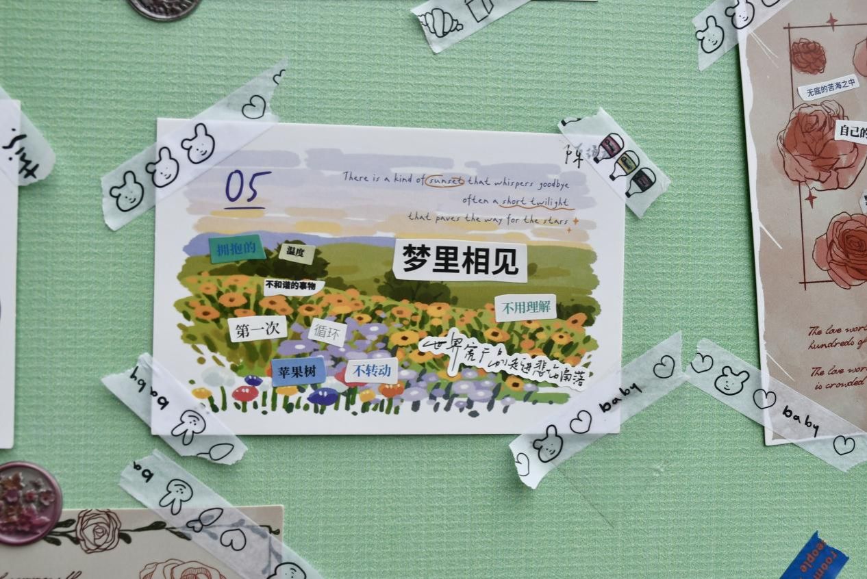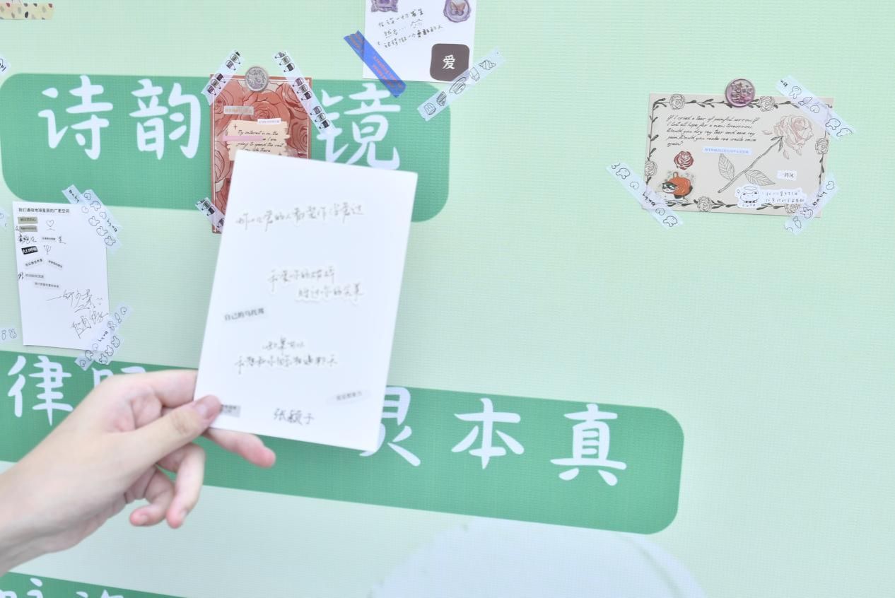 青云书院化身为“流动的诗歌展厅”,数百张承载着学生原创诗句的明信片悬挂于绿树繁花之间,随风轻摆的纸笺与沙沙作响的树叶相映成趣。学生们穿梭于诗意盎然的庭院中,或驻足品读诗句,或拍照记录美好,在自然与文字的交织中感受“沉浸式”的诗意体验。