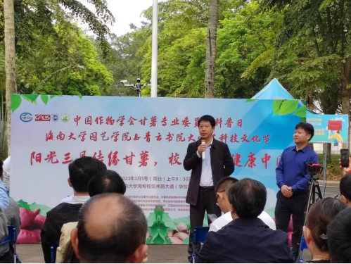 活动开幕式按议程进行。中国作物学会甘薯种质资源科学传播专家团队负责人致辞并向甘薯生产的重点企业代表赠送《甘薯防灾减灾技术》科普图书;梁谋副校长致欢迎辞,表达了对各位甘薯专家、企业代表的欢迎,希望校园科普活动能把健康传递给广大师生,并宣布活动开幕。