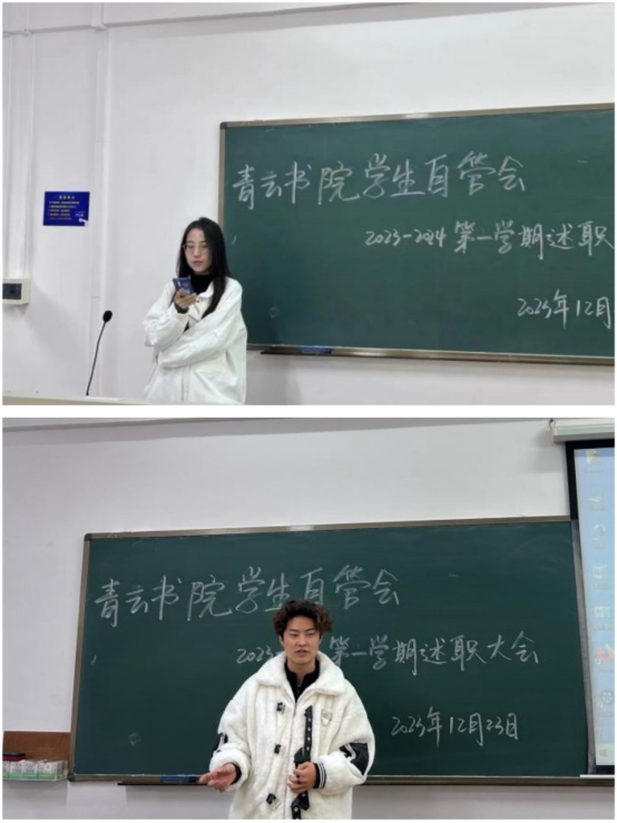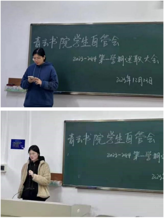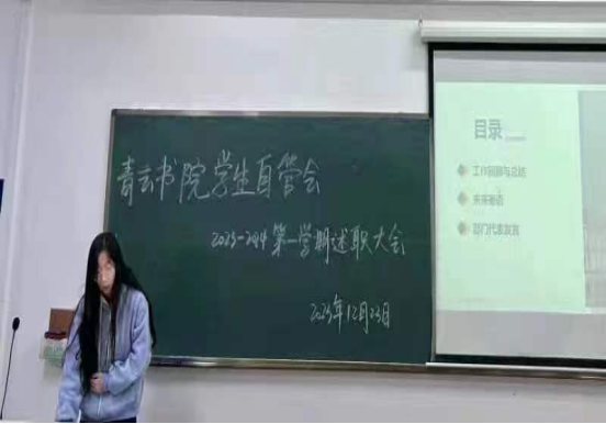 日月如梭,时光荏苒,一学期的时光悄悄流逝,本学期青云书院学生自主管理委员会的工作也接近尾声。回首旅途,自管会全体成员齐心协力共同完成了许多任务。12月23日下午,青云书院学生自主管理委员会召开了2023-2024学年第一学期述职大会,对本学期工作进行了总结。