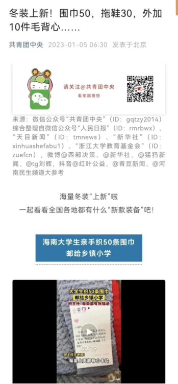 yl6776永利集团青云书院爱心艺术团2022年爱心围巾活动取得圆满成功。截止2022年12月15日,由我们志愿者一针一线织出的围巾已经全部寄出,社团的志愿者们也收到了许多感谢,有的虽然只是一条短信,一张照片,但是同学们心中充满了欣喜和激动。这一暖心举动获得了共青团中央的点赞。