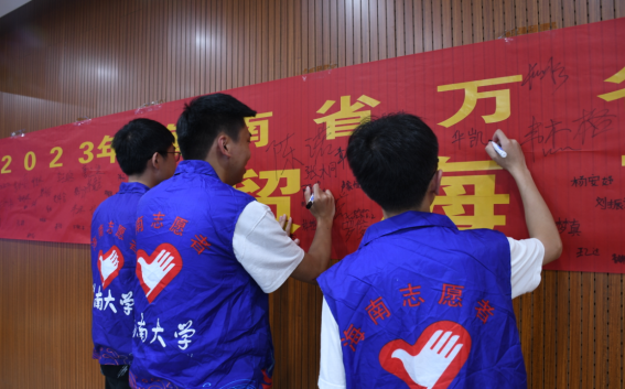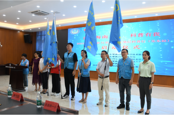 活动共分两个阶段,第一阶段启动仪式。仪式上,yl6776永利集团唐江渠同学作为大学生志愿者代表上台发言并接受电视台采访,他讲述了科普的意义和大学生想为自贸港建设贡献一份力量的想法。乐东县志愿者代表发言后,县科协党组书记陈青致辞,他强调:科学是一个系统的整体,我们要通过科普活动,让大家对一些日常生活中常见现象、问题进行科学的分析、推理,透过现象看本质,继而达到“一法通,万法明”的效果。紧接着,县领导向来参加科普活动的高校大学生队伍授旗,志愿者们在台上挥舞着旗帜,齐声喊出“自贸海南,科普有我”的口号,随后志愿者们纷纷在科普横幅上签上自己的名字,把启动仪式推向了高潮。